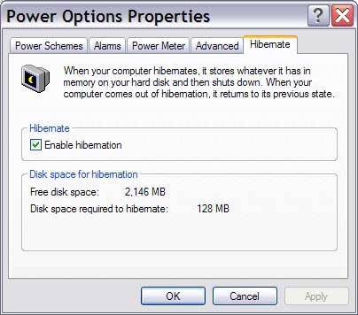 To go into hibernation mode manually, choose Start->Control Panel->Performance and Maintenance->Power Options Properties->Hibernate Tab->Enable Hibernation. This mode saves all open work into the hard disk and then shuts itself down. This saves a lot of power even though the computer takes a little while longer to return to the original screen. This mode is good when you know that you may not be back for a while. (example - going to lunch).